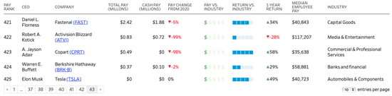 另一个和马斯克“作伴”拿低薪的大佬是“股神”沃伦·巴菲特,他2021年只从伯克希尔-哈撒韦公司(Berkshire Hathaway Inc) 拿了37万美元的年薪,位列榜单倒数第二。