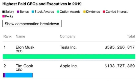 而2019年他的年薪还高达5.95亿美元,排名第二的库克当年的1.33亿美元年薪和他一比,都只能算“弟中弟”。