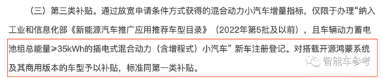 第三类补贴,面向放宽申领条件获得的混合动力车型增量指标,符合工信部《新能源汽车推广应用推荐车型目录》(2022年第5批及以前),且动力电池能量≥35kWh的插电式混合动力(含增程式)的车型。