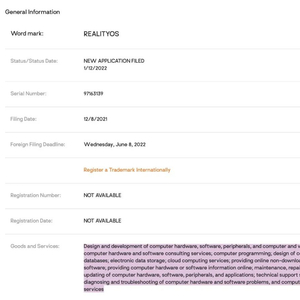 不过2022年5月中下旬多日,美国专利商标局接连公布来自苹果的多项AR/VR头显专利。其中有涉及眼球追踪系统的,有新款AR头显独用透镜,有支持3D显示、动态变焦的VR头显方案。2022年5月29日,资深果粉、给多家商业科技网站供稿的Parker Ortolani,在推特上公布美国专利商标局上的注册申请信息:苹果的realityOS商标正在悄悄注册中。