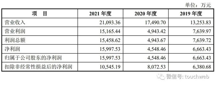 铖昌科技2019年、2020年、2021年营收分别为1.33亿元、1.75亿元、2.1亿元;净利分别为6663.43万元、4548.46万元、1.6亿元;扣非后净利分别为6380.68万元、8072.5万元、1.05亿。