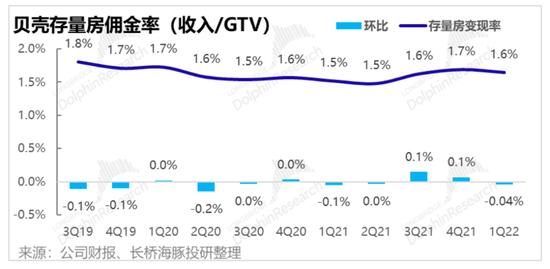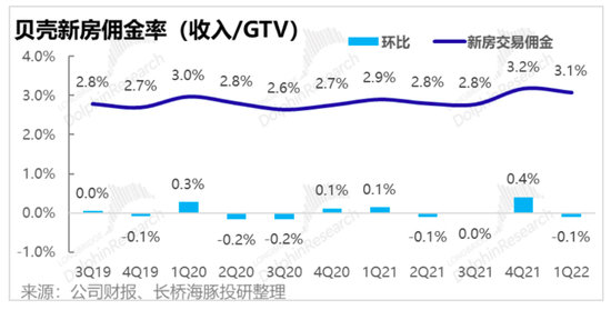 事实上,无论是贝壳的二手房佣金率还是新房佣金率,其已经来到一个压力位,为了应对去年下半年行业的断崖式下滑,其已经通过提佣的方式做了业绩对冲。在今年政策底已现的前提下,高佣金率持续时间也将面临考验,我们已经看到2022Q1期佣金率出现环比下降的趋势。