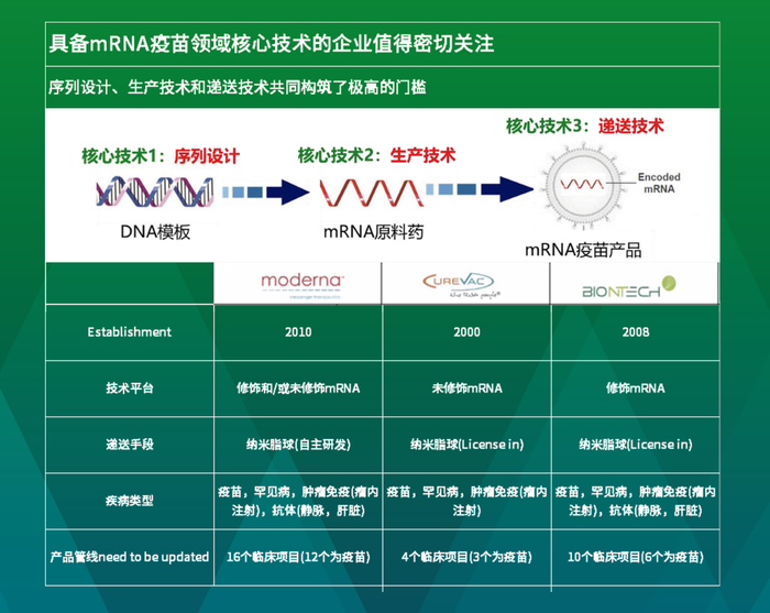 也正是基于以上特点,红杉中国医疗投资团队认为,具备mRNA疫苗领域核心技术的企业值得密切关注。与其他疫苗不同,mRNA疫苗最主要的挑战还在于如何更有效地表达抗原蛋白,增强产品的稳定性,让产品在体内表达的时间更久和更安全。而由于mRNA药物非常不稳定,进入体内后被快速降解。所以利用序列设计、生产技术和递送技术提高mRNA的稳定性和表达效率是mRNA疫苗研发核心技术与门槛。