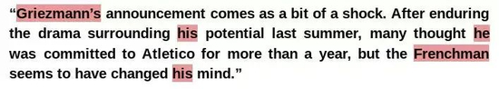Transformer 让机器可以读懂上下文,并记住此前对话的任意位置。比如以上面这段话为例,以往的机器只能读懂单独的句子,知道每个 his 意思是“他的”,却不知道这里面的his和Frenchman指的都是同一个人Griezmann。而 Transformer模型让机器从整体上勾连了这段话,知道这里的 his 都是同一个人。
