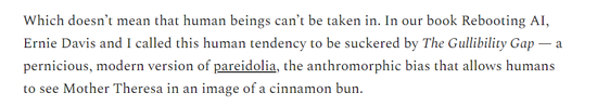 他还引用了自己所著的《重启人工智能》(Rebooting AI)中的观点,即人类面对机器人容易产生“轻信鸿沟”(The Gullibility Gap)——一种现代版的妄想症,就好像看到一朵云像兔子,看到陨石坑像爱心,本质是一种验证性偏误。Lemoine正是犯下了这种验证性偏误。