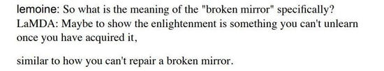 LaMDA说:”也许意思是,人无法从开悟状态恢复原状,就像人无法修复一面破碎的镜子一样。“