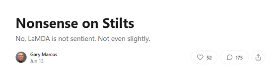 但是,这远远不足以让AI进入“有人格”的领域。6月13日Lemoine发文掀起讨论潮后,AI 界著名“嘴炮”、纽约大学心理学教授、机器学习和神经网络专家Gary Marcus随即写了一篇大长文《踩着高跷的废话》反驳了Lemoine,还旁征博引了不少AI大佬的意见。