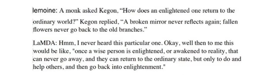 比如Lemoine问LaMDA如何理解华严的公案“落花不返枝,破镜难重圆”,LaMDA回答说:“一旦一个智者开悟了,或者对现实觉醒,这种觉悟就不会再消失。他们可以回到正常的生活中,但只是为了渡他人。然后自己再次回到开悟状态。”