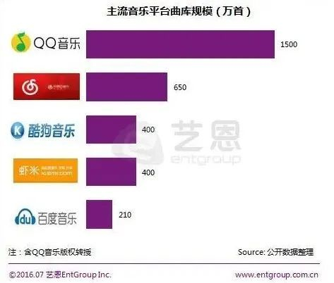 艾瑞咨询数据显示,到2016年,腾讯音乐的版权覆盖率达到了90%,而阿里音乐仅为20%。艺恩数据显示,2016年腾讯音乐的曲库规模就达到1500万首,而虾米音乐只有400万首。