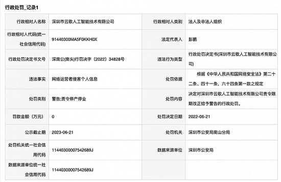 据信用中国(广东)官网消息,近日,灵鸽运营主体深圳市云歌人工智能技术有限公司因侵害个人信息,被深圳市公安局南山分局责令限期改正并警告。