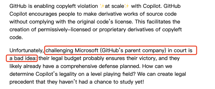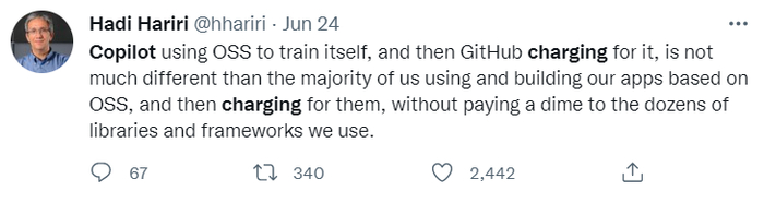 他表示,「Copilot用OSS(Open Source Software,开源软件)来训练,然后GitHub还要收费。这就跟我们大部分人用OSS开发app,还要收钱一样。那是不是也得给用的数据库和框架付钱啊?」
