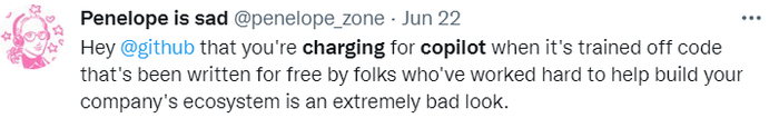 网友Penelope is sad同样表达了自己的不满,他表示,「GitHub你收Copilot钱?Copilot上都是我们这些人辛辛苦苦免费写的代码,我们帮你们搭建了不错的生态。你还要收钱?」
