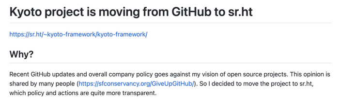 他表示,要把Kyoto project将从GitHub转移到sr.ht。