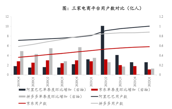 对比京东、阿里和拼多多三大电商平台的用户数,京东的5.805亿的用户数远低于另外两家(阿里中国10.05亿;拼多多8.82亿)。但体态更为轻盈的京东,近一年的用户数单季环比增速往往低于身躯更为庞大的阿里。今年Q1,京东年度活跃用户数仅同比增长16.15%,低于同期阿里的23.92%。