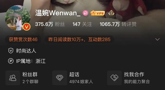 而回到温婉本身,被抖音封禁,某种程度上促成了温婉的转型。凭借在抖音的流量积累,温婉圈到了一定的私域流量:在微博,她拥有三百多万粉丝。凭借相对出众的容貌,温婉顺利转型成美妆博主,接到了一定数量的广告。