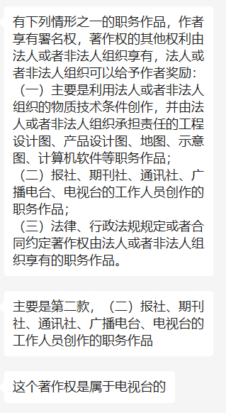 其次,在制作节目之前,双方可能通过合同等进行了协议约定,如果知识产权此时已约定好归电视台,这种情况著作权也不属于谭Sir。