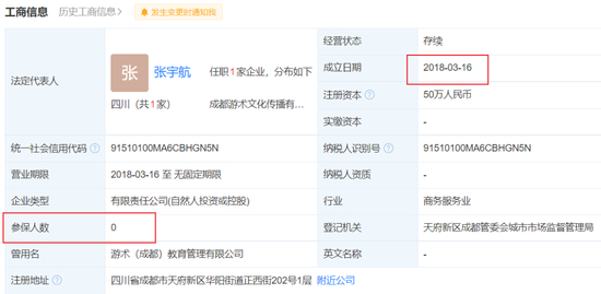发现这家公司成立时间非常短,成立于2018年,注册资本50 万,实缴资本为 0 ,并且成立四年,每年年报都显示参保人数为 0 。
