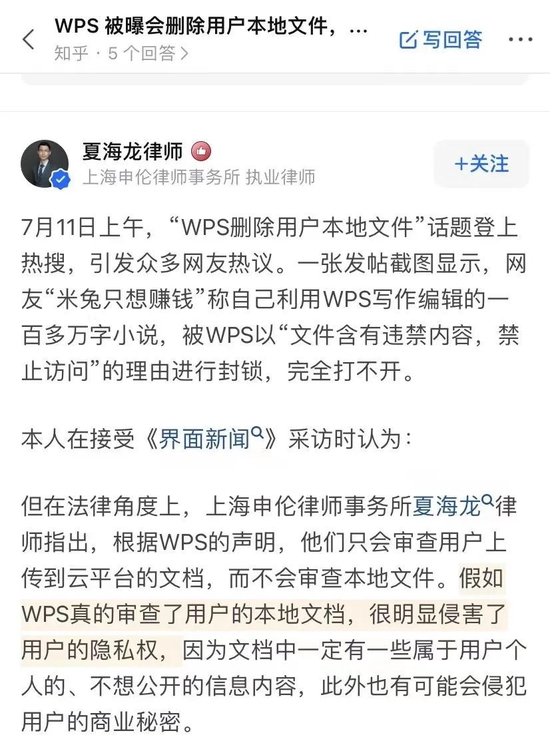 一名律师在知乎上称,假如WPS真的审查了用户的本地文档,很明显侵害了用户的隐私权。