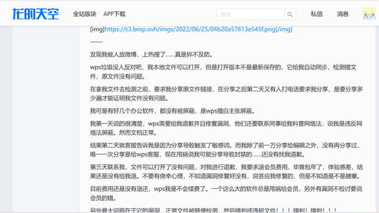 “WPS客服告诉我是因为分享导致触发了敏感词。而我除了前一万(晚)分享给编辑之外,没有再分享过,唯一一次分享是给WPS客服。”米兔的帖子里写道。