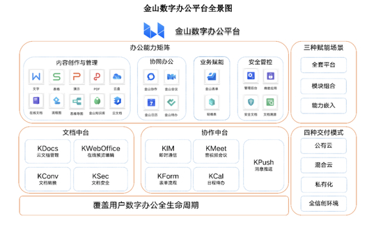 去年12月,金山办公发布了数字办公平台,基于办公产品急诊,进行云化、中台化和二次开发之后,打造的涵盖内容创作与管理、协同办公、业务数字化的赋能解决方案。