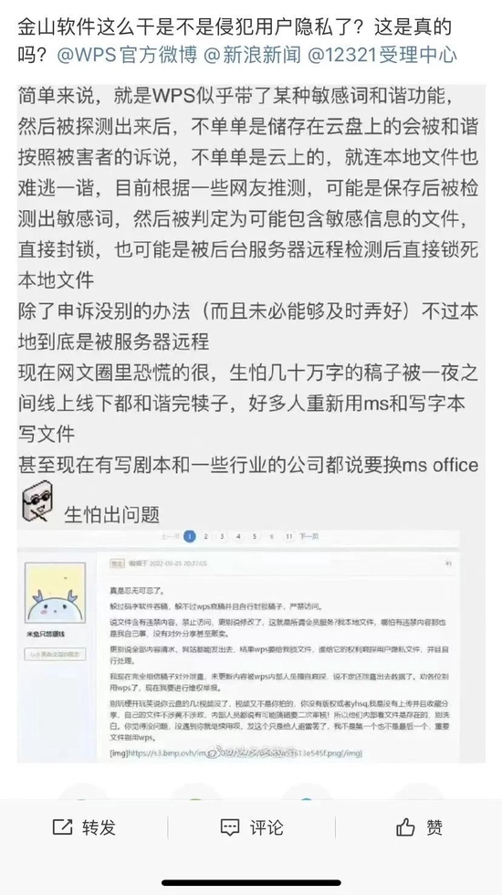 7月11日上午,一名用户发布微博,配图中称WPS似乎带了某种敏感词和谐功能,在被探测出来之后,不只是存储在云盘上的(相应的文件)会被和谐,根据受害者的诉说,就连本地文件也难逃和谐。这位用户也不能确定是怎么回事,所以发博问一问。