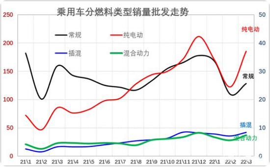 以中国市场为例,乘联会数据显示,2022第一季度中国乘用车市场总销售量为491.5万辆。其中传统燃油车和新能源车出现了此消彼长的现象。新能源车总销售量为107万辆,虽然总量占比和燃油车占比相比仍处弱势,但实现了146.6%的同比增长,传统燃油车总销量虽然高达385万辆,但总销量却出现了18%的较大同比下滑,新能源车与传统燃油车的销量形成K字形走势。
