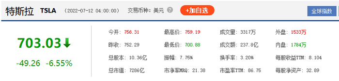 在特斯拉苏州钣喷中心大火之后,特斯拉的股价出现较大波动,截止7月12日收盘,特斯拉股价为703.03美元/股,较上一日收盘下跌了49.26美元/股,一日之间市值蒸发510.3亿美元,距2020年8月7日最高1835.64美元/股,股价跌幅为62%,市值更是蒸发了11734亿美元。
