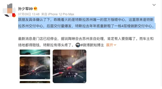 据BT财经查询,其实在微博上有博主在7月9日已经曝料,不过该消息被淹没在其他热点下,曝料博主账号为“孙少军09”,是微博大V,该博主发文称:“跟朋友具体确认了下,昨晚(7月8日)着火的是特斯拉苏州唯一的官方钣喷中心,这里原来是特斯拉苏州交付中心,后面交付量爆发,特斯拉去年年底重新租了一栋4层楼做新交付中心。”,从他再三跟朋友确认才发文来看,说明是经过求证后才发的微博,以微博和抖音的及时资讯的特征来看,这个微博延后一天发的并不算“及时”。