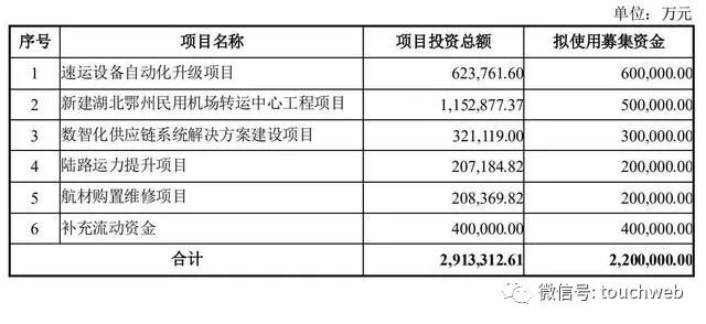 2021年2月,顺丰控股宣布募资220亿元,其中,60亿元用于速运设备自动化升级项目,50亿元用于新建湖北鄂州民用机场转运中心工程项目,30亿元用于数智化供应链系统解决方案建设项目,20亿元用于陆路运力提升项目,20亿元用于航材购置维修项目,40亿元用于补充流动资金。