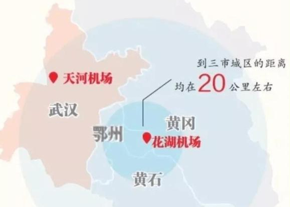 花湖机场位于鄂州、黄石、黄冈三市“几何中心”,与三市城区距离均在20公里左右,车程约20分钟。花湖机场到武汉光谷直线距离约60公里,仅需1小时车程;到武汉火车站和武汉天河机场直线距离约100公里,乘车仅需1.5小时。