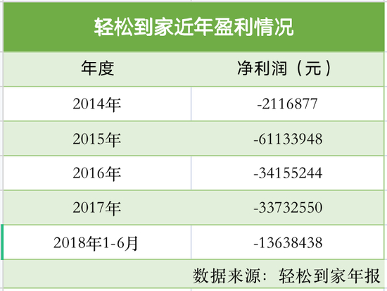 实际上,轻松到家常年处于亏损状态,据此前轻松到家在新三板信息披露的资料显示,2014年-2018年上半年,其净利润均为负。
