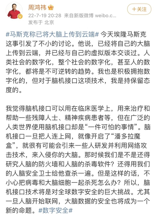 7月19日晚间,360集团创始人、董事长周鸿祎发了篇微博,认为在广泛的人类世界使用脑机接口是“一件可怕的事情”。