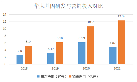 从财报数据看,2021年,华大基因的研发费用支出为4.87亿元,同比下降21.38%,研发费用率为7.2%。当年度销售费用为12.38亿元,同比增长14.82%,销售费用率为18.3%。当年销售费用比研发费用多了7.51亿元。