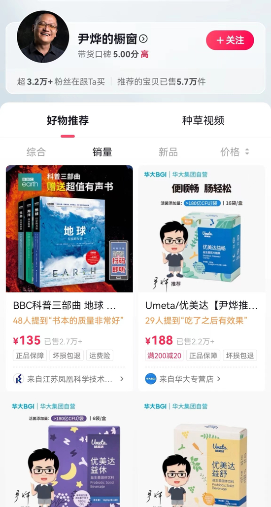 销量最好的BBC科普三部曲和优美达益生菌,售价分别为135元和188元,销量分别为2.7万+和2.2万+。按目前的销量粗略计算,尹烨抖音橱窗已卖出5.7万件商品,已获得超2000万元销售收入。