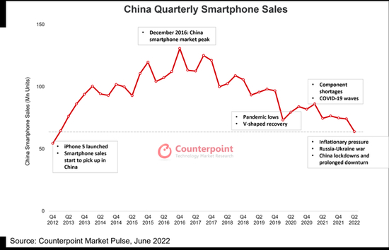 4.市场调研机构Counterpoint的数据显示:2022年Q2中国智能手机销量同比下降14.2%,创下过去十年来的历史新低,其销量不到2016年第四季度历史销量峰值的一半。