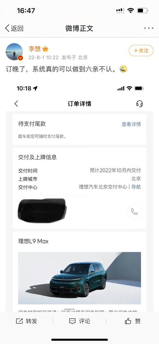 8月1日上午十点,理想正式确定之前小订的L9汽车交付时间。仅仅22分钟后,李想就在微博秀出订单。第二天下午,各个理想汽车车主群里,计划购买理想L9的车友们也纷纷开始晒单,讨论起订单交付时间。