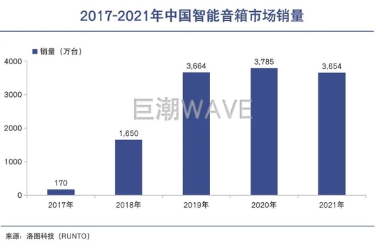 洛图科技数据显示,2017年-2019年国内智能音箱市场销量从170万台增长至3664万台,2018年、2019年的销量增速分别为823%和126%。整个赛道迎来了一轮爆发式增长,中国也迅速成长为全球最大的智能音箱市场。