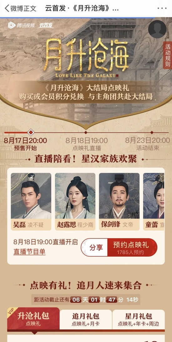 更令部分观众反感的是,腾讯视频一次次明目张胆的“割韭菜”操作。在腾讯控股发布2022年Q2财报后不久,腾讯视频电视剧官微官宣将复制《梦华录》的“超前点播”模式,于18日19点开启《星汉灿烂·月升沧海》大结局点映礼直播。