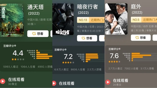 很可惜,腾讯视频在Q2主推的独播悬疑剧《通天塔》没能持续推动《开端》带来的逆转。反倒是优酷在Q2产出了一部豆瓣7.6分的《庭外》,爱奇艺也凭借《暗夜行者》有效缓解了“迷雾剧场”的口碑压力。