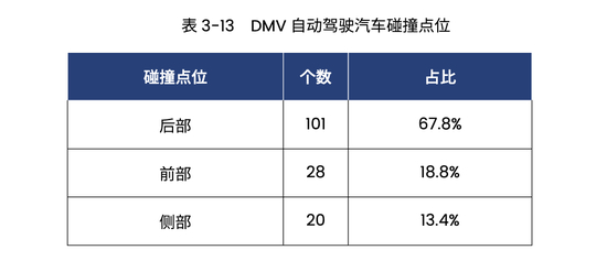 其中,在2019-2020年时间段内,自动驾驶汽车发生事故时,后部碰撞(其他道路交通参与者追尾正常行驶的自动驾驶汽车)点位个数为101个,占比67.8%。