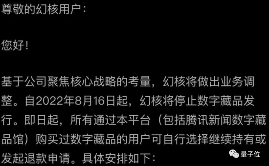 这两天,腾讯数字藏品平台(NFT交易软件)幻核也发布公告,停止数字藏品发行,用户可选择继续持有或发起退款申请。