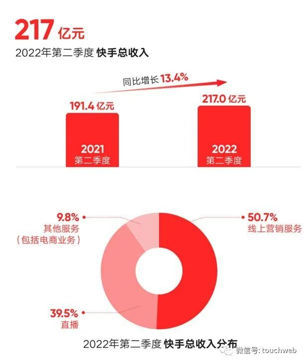 数据显示,快手2022年第二季度总营收同比增长 13.4%至217亿元,高于彭博市场一致预期的207亿元。其中,线上营销服务(即广告)、直播和其他服务(含电商)对收入的贡献占比分别为50.7%、39.5%和9.8%。