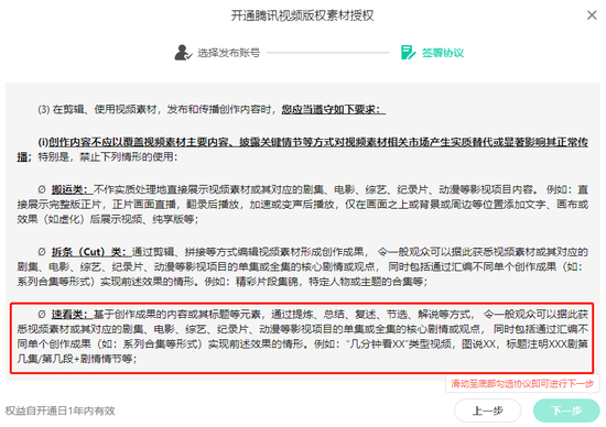 因为在腾讯视频版权素材开放给智影用户的协议中,腾讯还是做出了诸多限制,比如禁止了创作者对于速看类内容的创作,其中还点名提到了不得创作“几分钟看XX”类型视频。