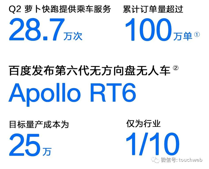 第二季度,百度旗下自动驾驶出行服务平台萝卜快跑向公众提供了28.7万次乘车服务,同比增长近500%。百度称,截至2022年7月20日,萝卜快跑累计订单量达到100万单。坐稳全球最大自动驾驶出行服务商。