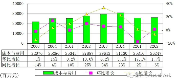百度2022年第二季度成本与费用为262.47亿元,较上年同期的278.87亿元下降6%。