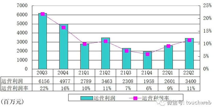 百度2022年第二季度Non-GAAP下运营利润达55亿元,运营利润率22%。