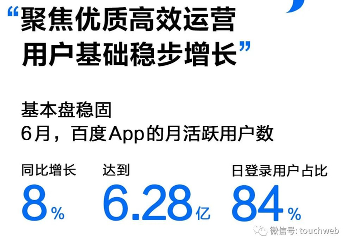 财报披露,百度App的MAU在 6月份达到6.28亿,同比增长8%。基于AI技术对于产品使用体验的助力,6月份,百度App的DAU中有84%是登录用户,高于一年前的76%。