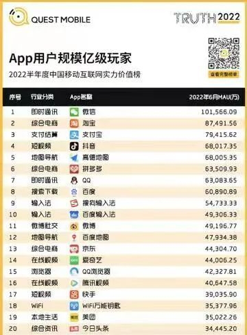 另据,QuestMobile2022年1月-6月媒介地位指数平均值排序,微信占据第一宝座,抖音、快手两大短视频平台分列第二和第三,腾讯视频和爱奇艺两大长视频平台则分别排名第七、第八,投放热度和价值度不敌短视频平台。