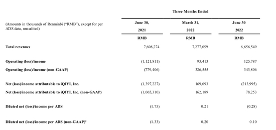 归属于爱奇艺的净亏损为2.140 亿元,不按美国通用会计准则(Non-GAAP),归属于爱奇艺的净利润为 7830 万元,而上年同期净亏损11 亿元。