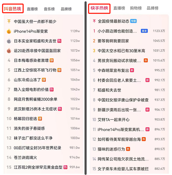 其次在内容上,就从两家的热榜就可以看出来,抖音热榜一般以资讯、明星网红为主,而快手热榜更多的是大众生活。快手最近一段时间力推的招工、短剧、体育赛事等场景也是同样更贴近生活需要的逻辑。